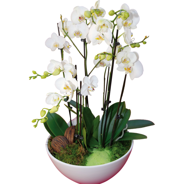 Parmi notre sélection d’orchidées, ce Phalaenopsis blanc se distingue par la pureté de ses fleurs fleurs, ainsi que la délicate courbe formée par la hampe. Cette orchidée blanche sera accompagnée de son cache-pot en céramique. Un cadeau élégant qui sera très apprécié.